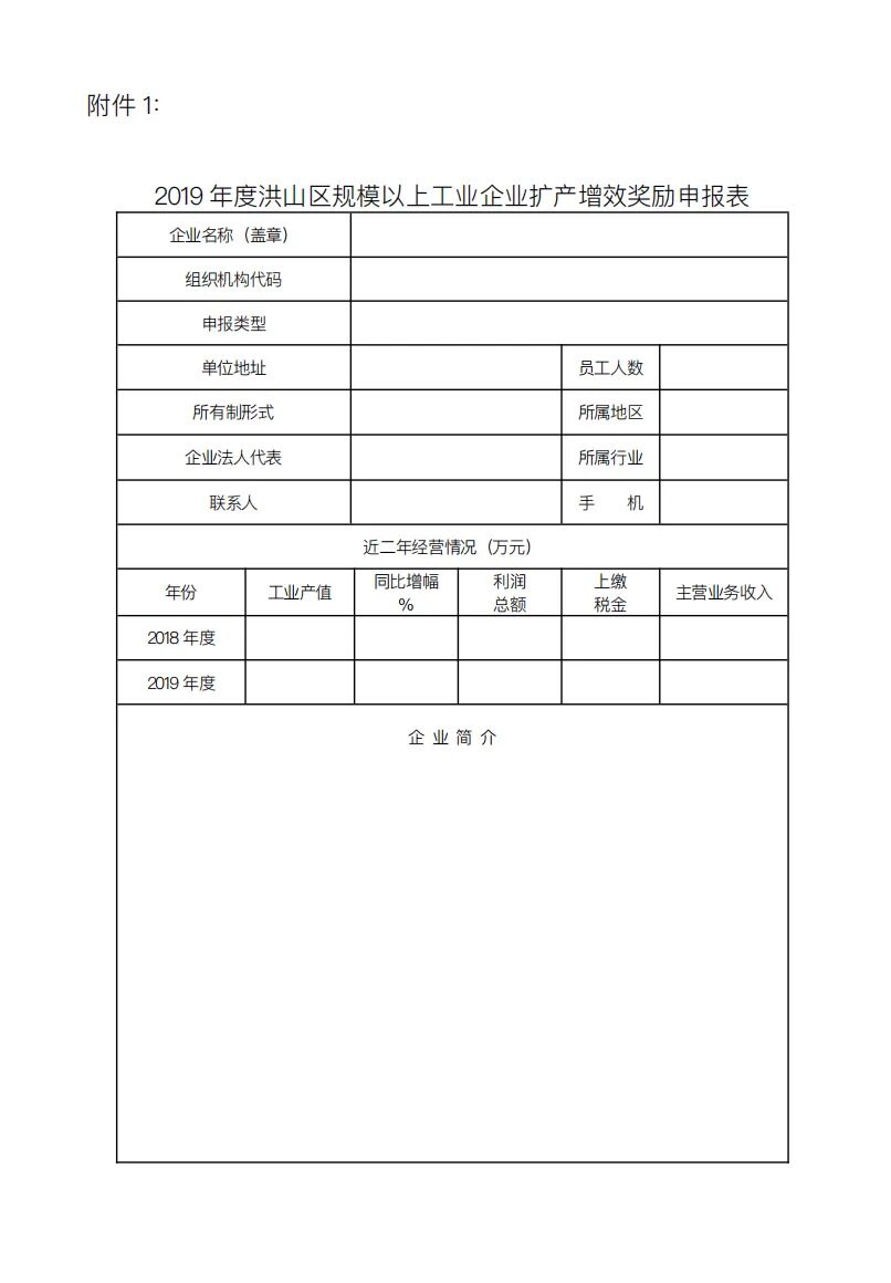 附件1: 2019年度洪山区规模以上工业企业扩产增效奖励申报表